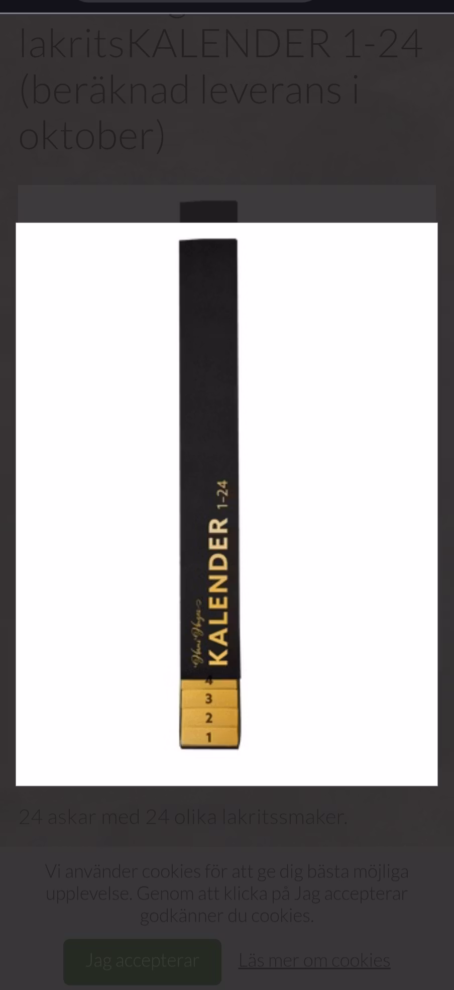 Adventskalender 319 kr Adventskalender med 24 olika lakritssmaker.En smak i varje lucka/låda.Vikt 250 gr I lager. Lägg i korgen Lagersaldo: 12 Dela Information Recensioner Adventskalender med 24 olika lakritssmaker.En smak i varje lucka/låda.Vikt 250 gr
