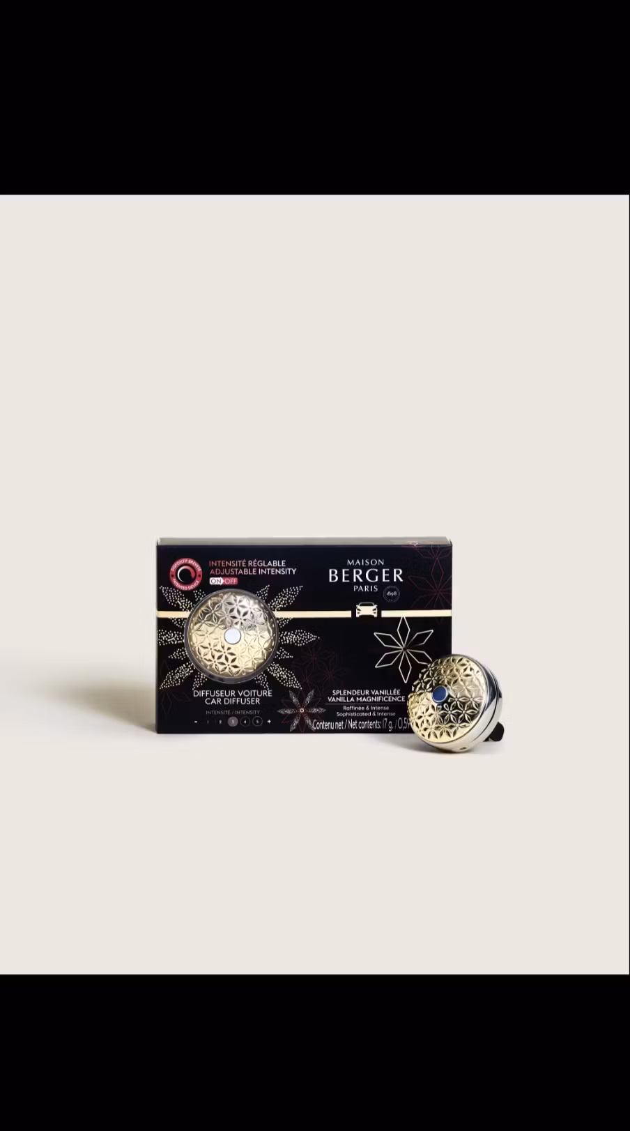 Det här är en komplett bildoft med en fälg / behållare i metall som man sätter i bilens fläkt. Den levereras med doften Vanilla Magnificent. Denna modellen kan ställas in hur mycket doft man vill ha genom att ställa luftflödet.